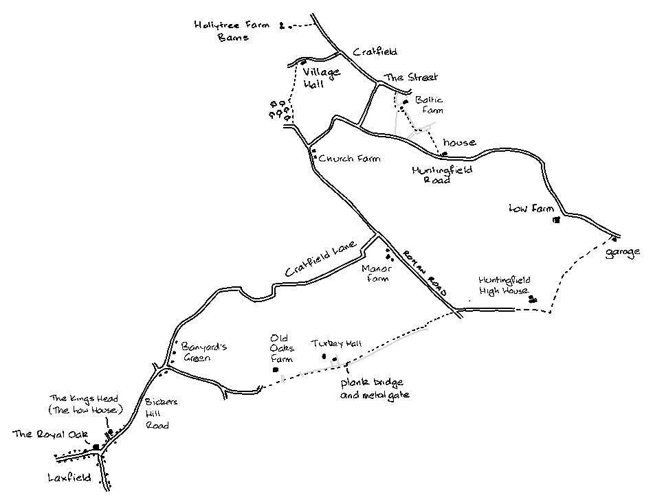 To return to Holly Tree Farm Barns, head back up Bickers Hill Road to Banyard's Green. Take the second left (Cratfield Lane). Follow this all the way to the roman road, about 1.5 miles. Turn left onto Heveningham Road, past the junction with Huntingfield Road onto Swan Green Lane. As Swan Green Lane bends left, there is a footpath to your right. This takes you through a wood, emerging into a field which has a path across towards Cratfield Village Hall. Turn right on Manse Lane, and left onto Bell Green back to your start point.